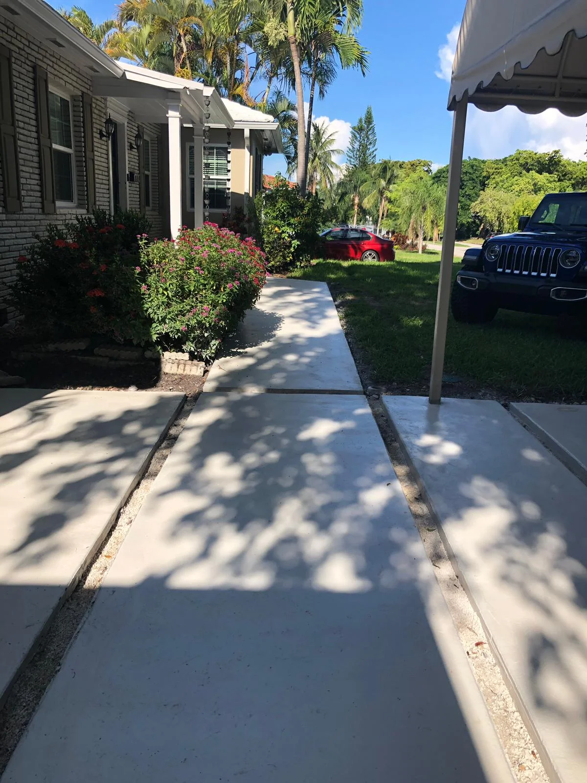 A homeowner in one of the beautiful Florida keys, Islamorada, hired ConcreteLux to polish the concrete, and the garage. As usual we began understanding the needs of the client, and began removing the existing overlay of the concrete. We actually found lots of stresses and worn out concrete realizing that it will not get a proper shine because of the many different repair patches. Instead of continuing the polishing work, we suggested to apply a dye that will end up giving it an even look. Our success can be seen in the pictures: with an outdoor UV resistant dye that is thick, covering all the blemishes, and leaving a sandy look. All in this beautiful oceanfront home.
